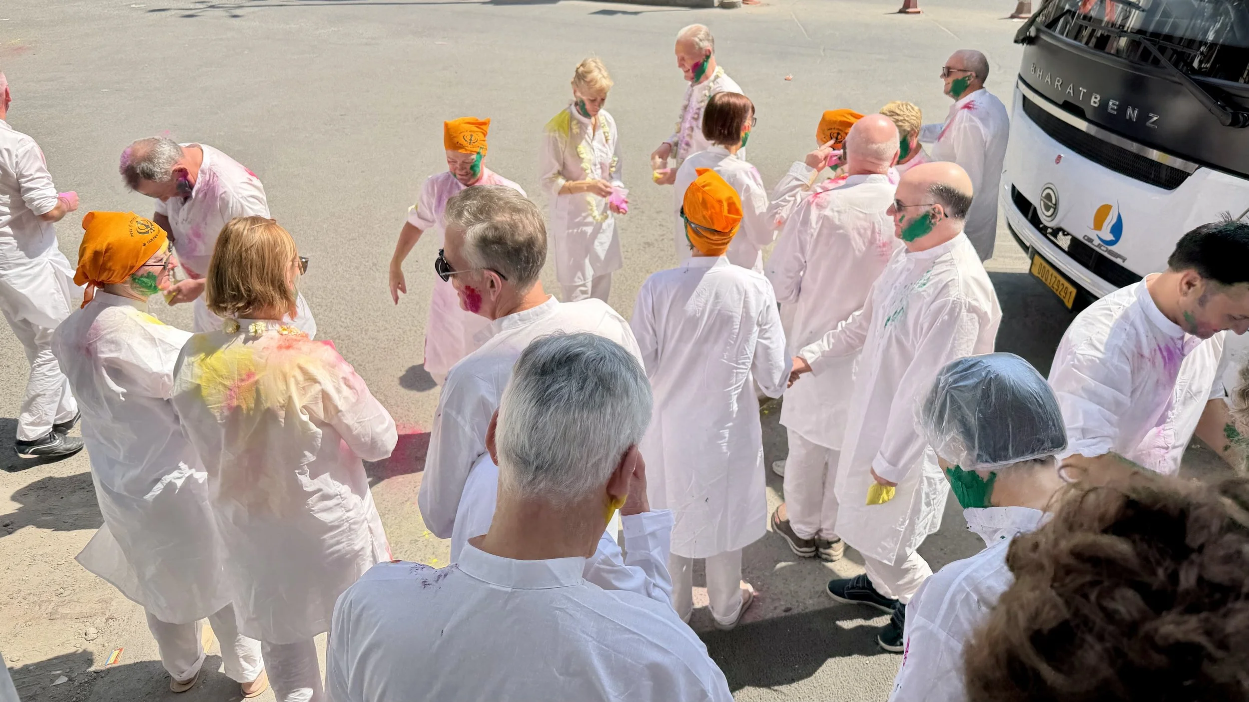 The transformation of our group was gradual but relentless. The once pristine outfits began to bloom with colour, first small fingerprints of powder, then streaks of yellow and green across shoulders and backs, and finally entire splashes of pink across shirts and hair.