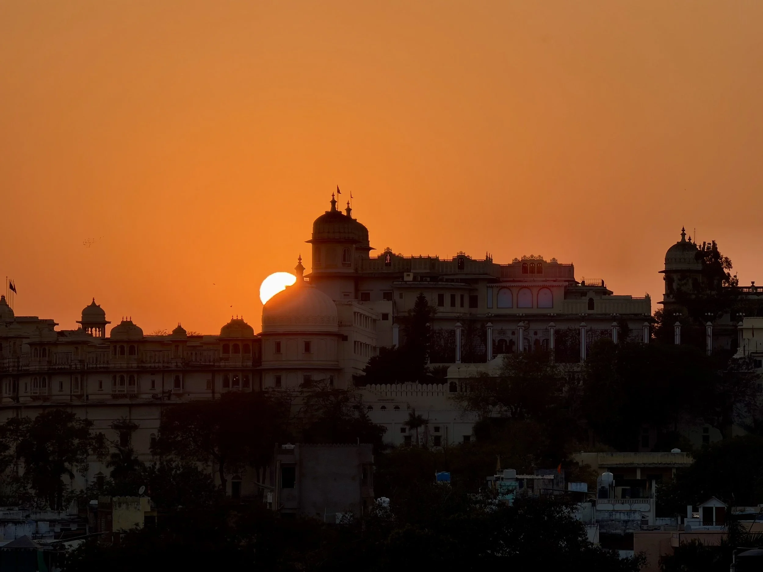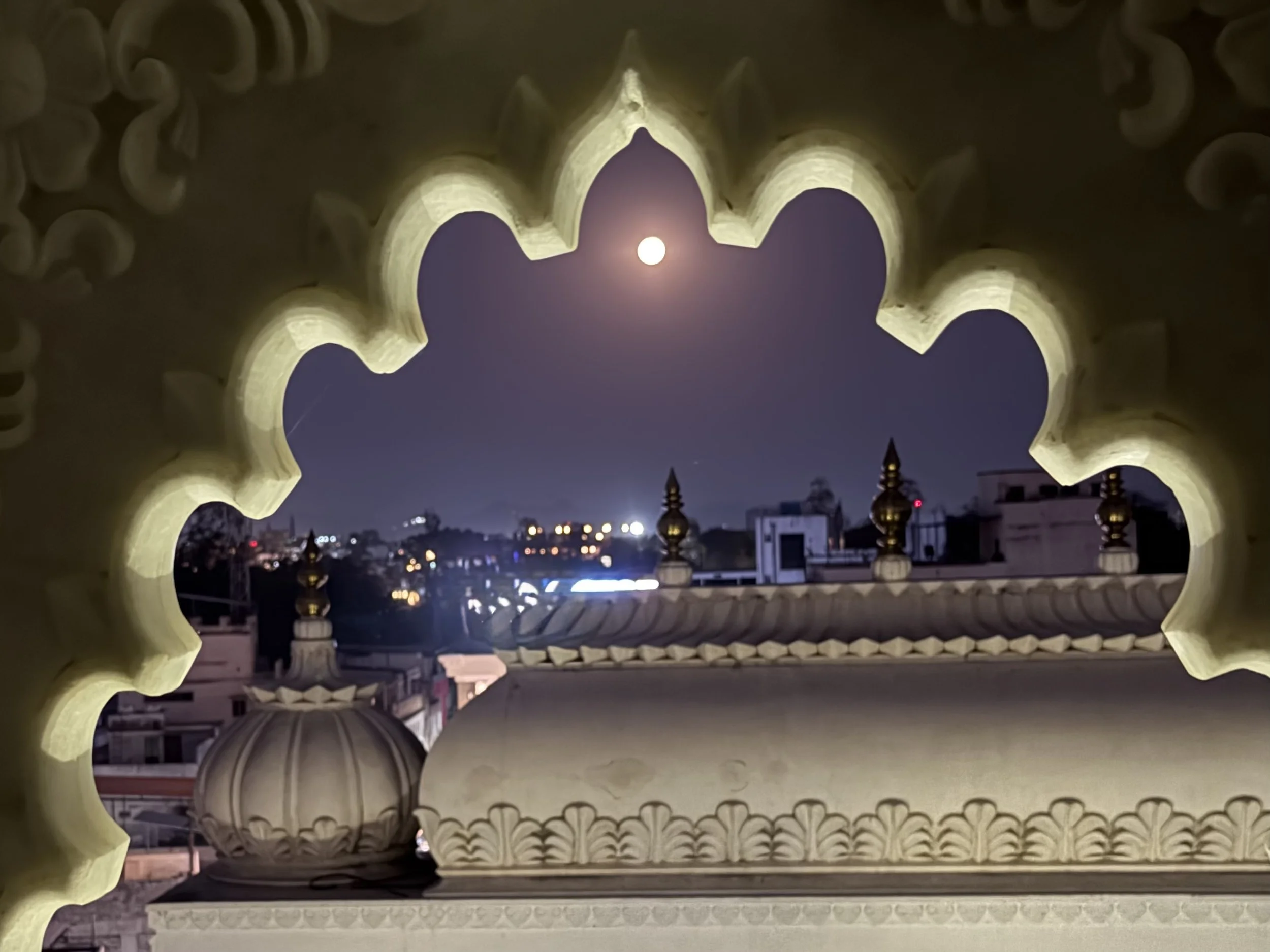 The day ended quietly, with a glowing sky, an eclipsed full moon, and the soft lights of Udaipur spreading out beneath us.