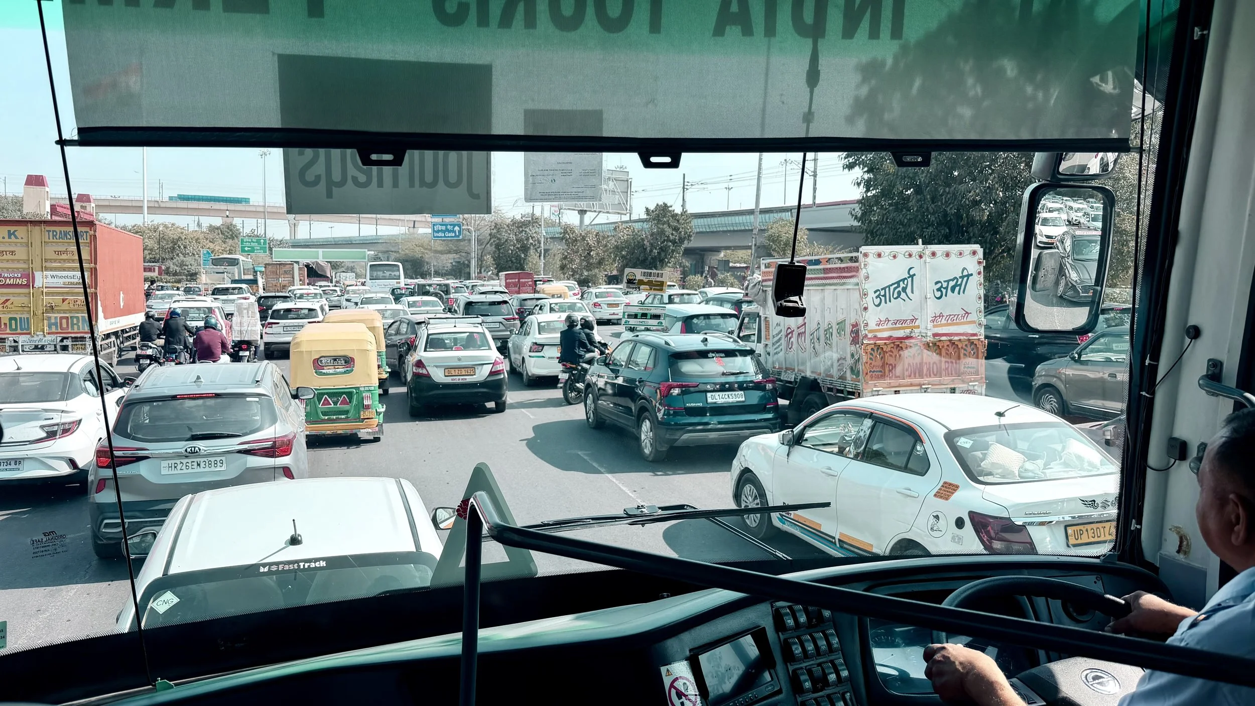 Little did we know that we still had a ninety-minute drive ahead of us, crossing the city from west to east. The usual Delhi traffic chaos was made worse by a high-profile AI conference taking place in the city, bringing added security, diversions and road closures. Nearly two more hours later, at around 1pm, we finally reached our hotel.