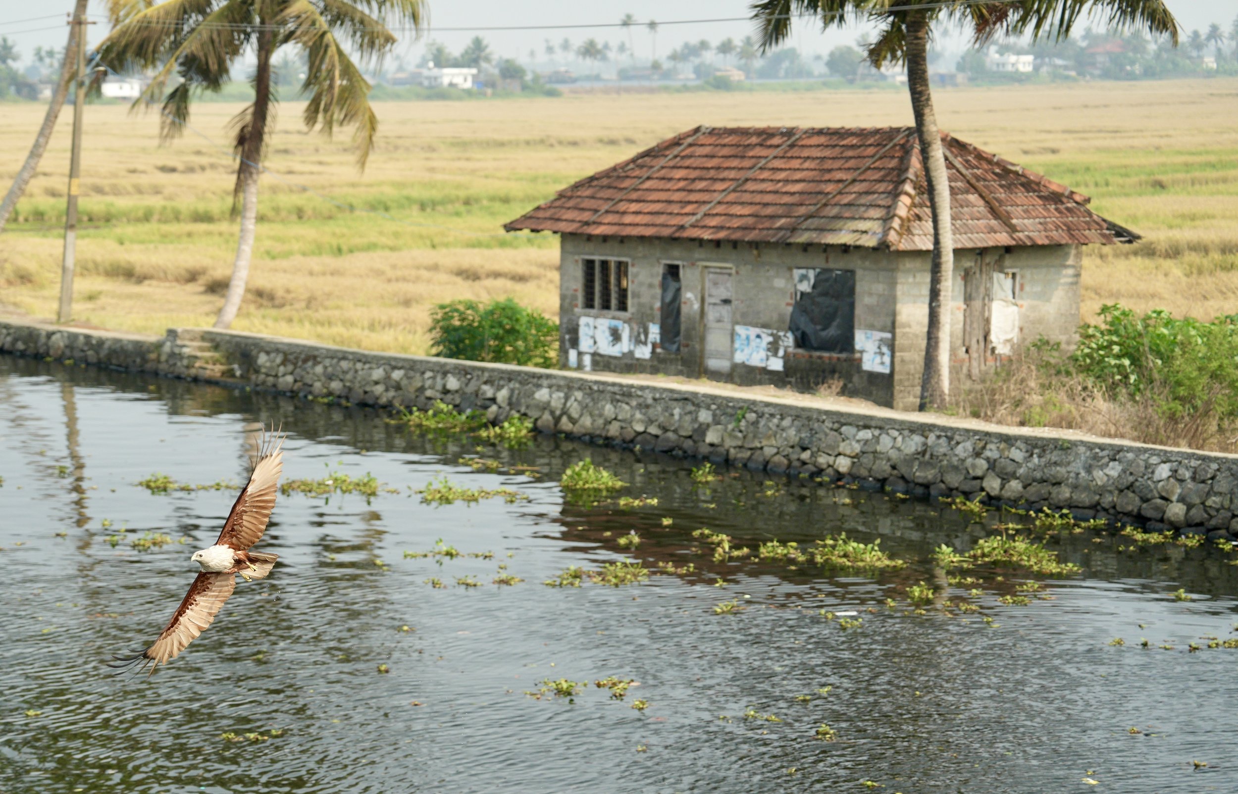 Above us, Brahminy kites circled on the warm air, their white heads bright against the hazy sky, and once one swooped low across the canal, wings spread wide, before lifting again over the palms. Kingfishers flashed across the water in sudden streaks of blue, gone almost before you realised you had seen them.