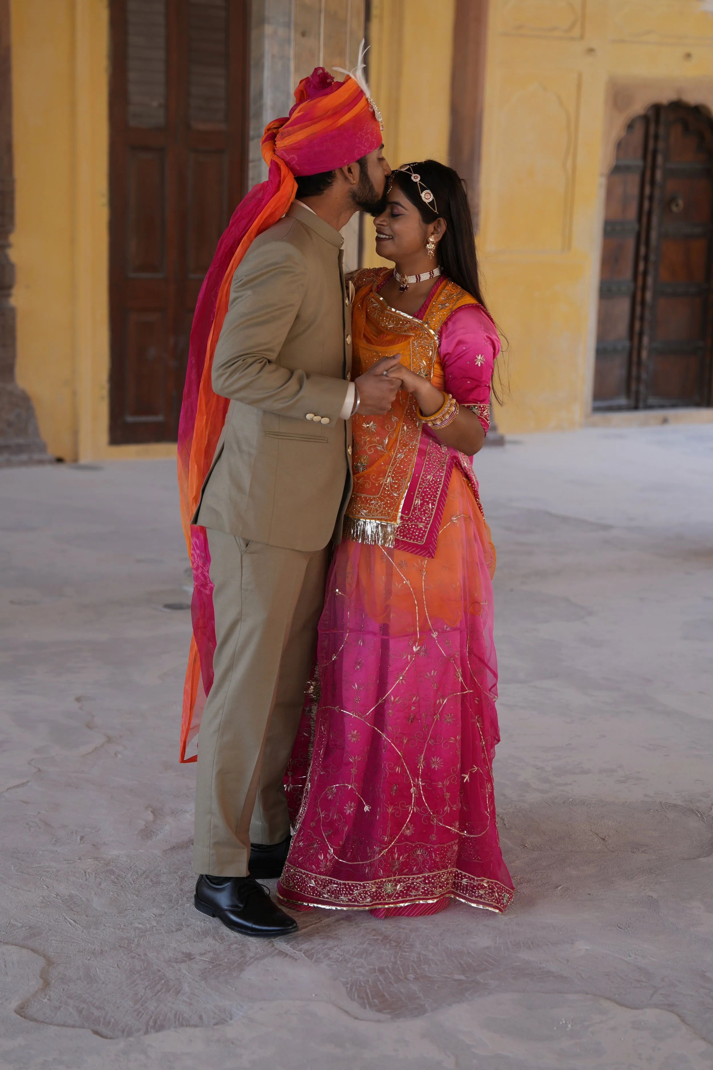 In the courtyard, more couples in elaborate dress posed for wedding photographs. One bride in a vivid pink and orange lehenga sat on the steps while a videographer crouched low to capture the perfect angle. Her groom, in a tailored beige suit and bright turban, leaned in for a staged kiss on her forehead.