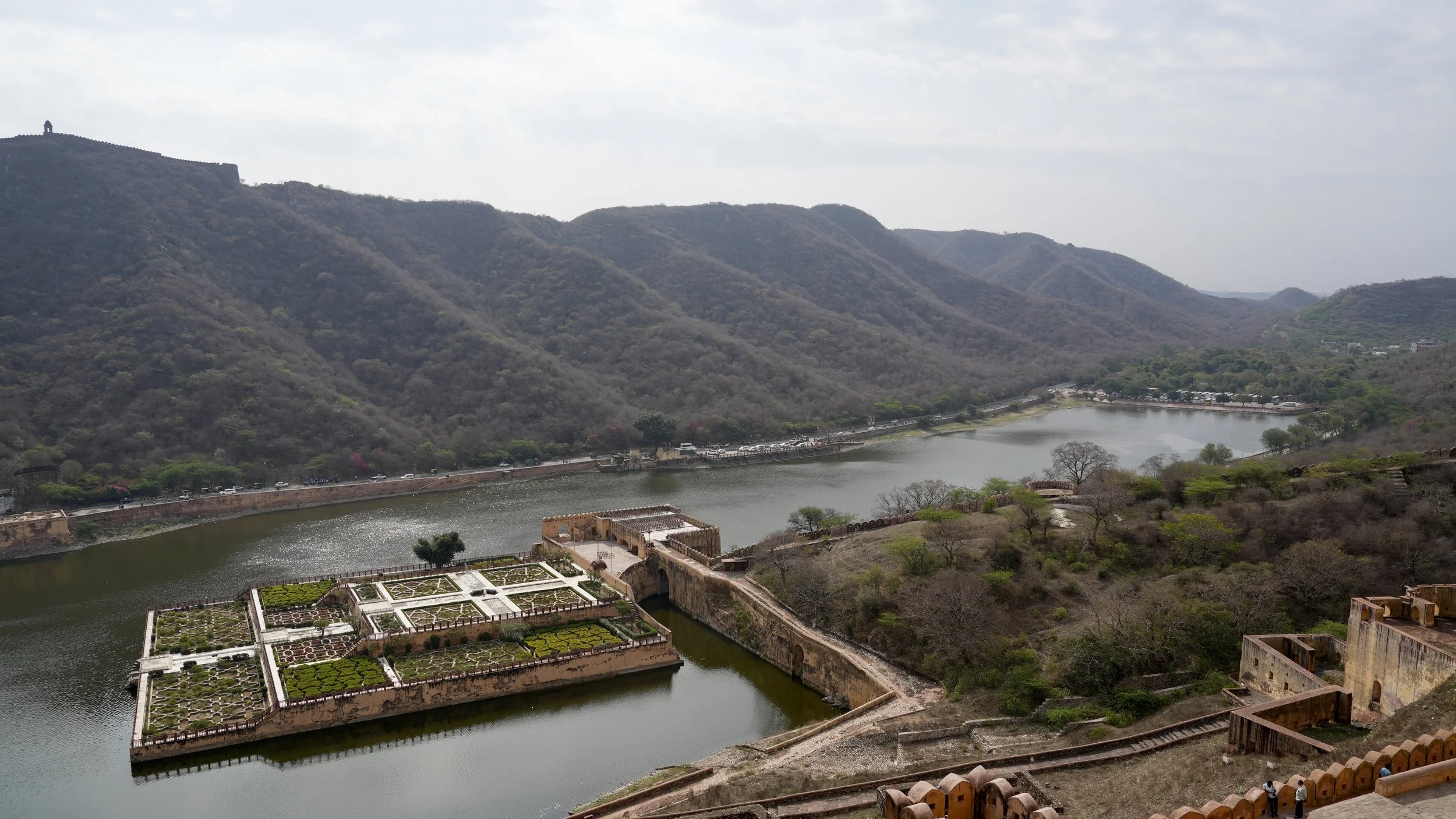 From the terraces, the views were extraordinary. Below lay Maota Lake with its formal Mughal garden laid out in symmetrical rectangles, like a patterned carpet floating on water. Beyond that, the hills rose steeply, stitched together by long defensive walls that ran along the ridgelines for kilometres. They loop and climb over the Aravalli hills in a way that inevitably invites comparison with the Great Wall of China. The scale is different, but the intent, visibility, dominance, protection, is the same. When we visited China the wall was edged with snow and ice; here the air shimmered in 31-degree heat.