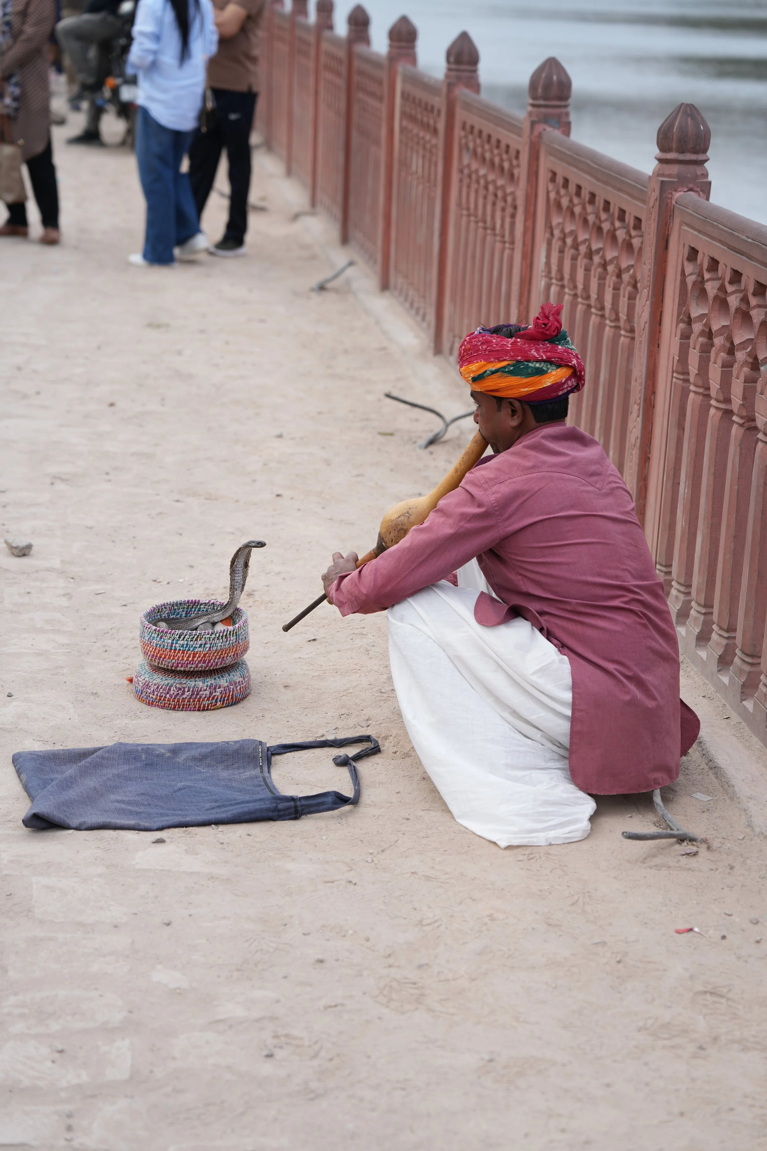 Along the lakeside walkway, a snake charmer sat cross-legged by the railing, his bright turban vivid against the dusty tones of the stone. A cobra rose from a woven basket as he played, a scene that felt almost theatrical against the monumental backdrop of the fort. Tourists paused, watched, photographed, then moved on.
