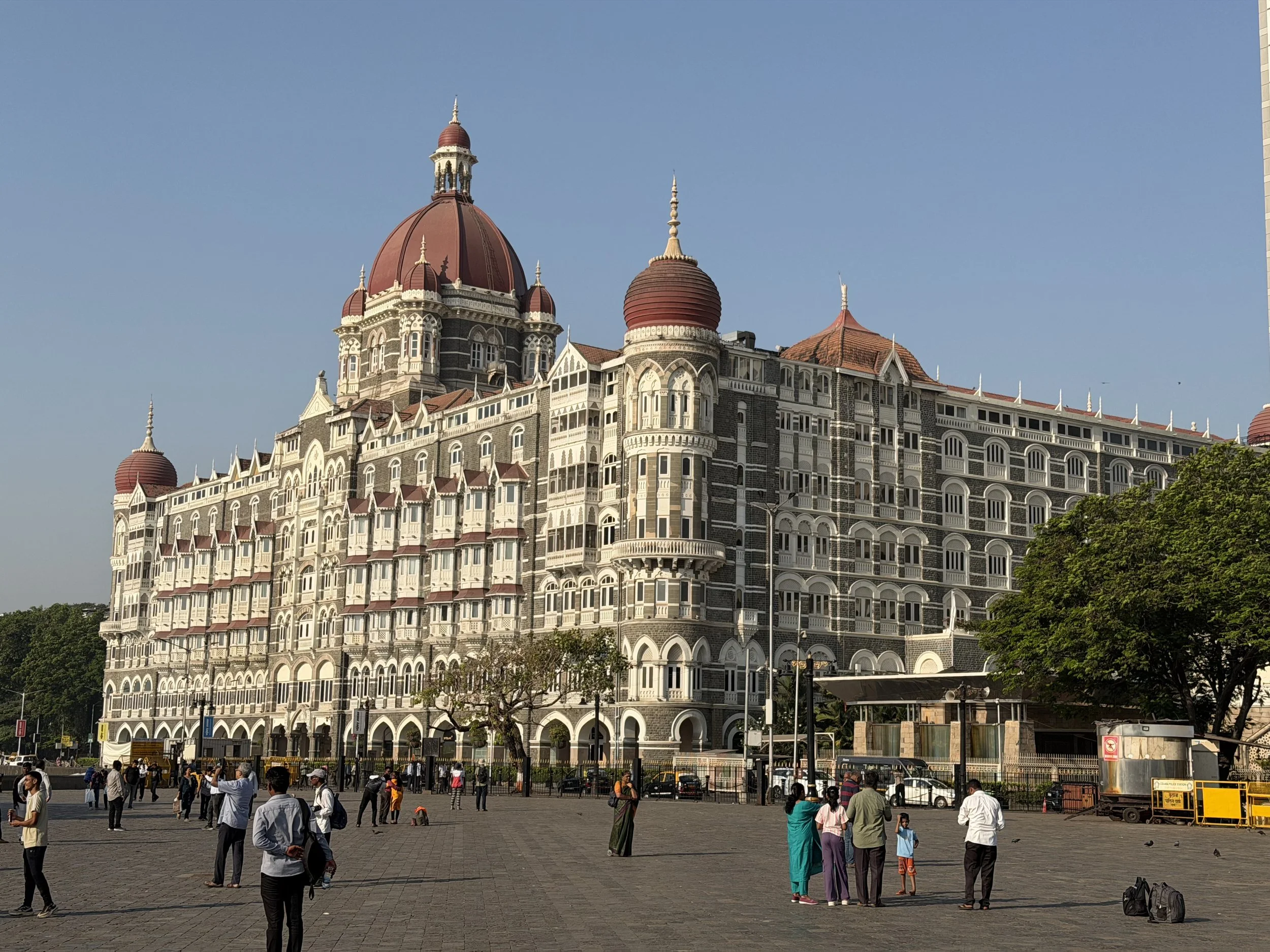 This time the scene felt noticeably different. The Gateway itself is now enclosed behind a security fence and visitors pass through a checkpoint before entering the plaza. Perhaps because it was still early in the morning, the atmosphere was far quieter than I remembered. The wide stone square around the monument felt surprisingly open, with only scattered groups of people moving across the space and the Arabian Sea stretching away behind it. Across the plaza the red domes and ornate façade of the Taj Mahal Palace Hotel caught the morning sun, looking every bit as grand as the stories attached to it.