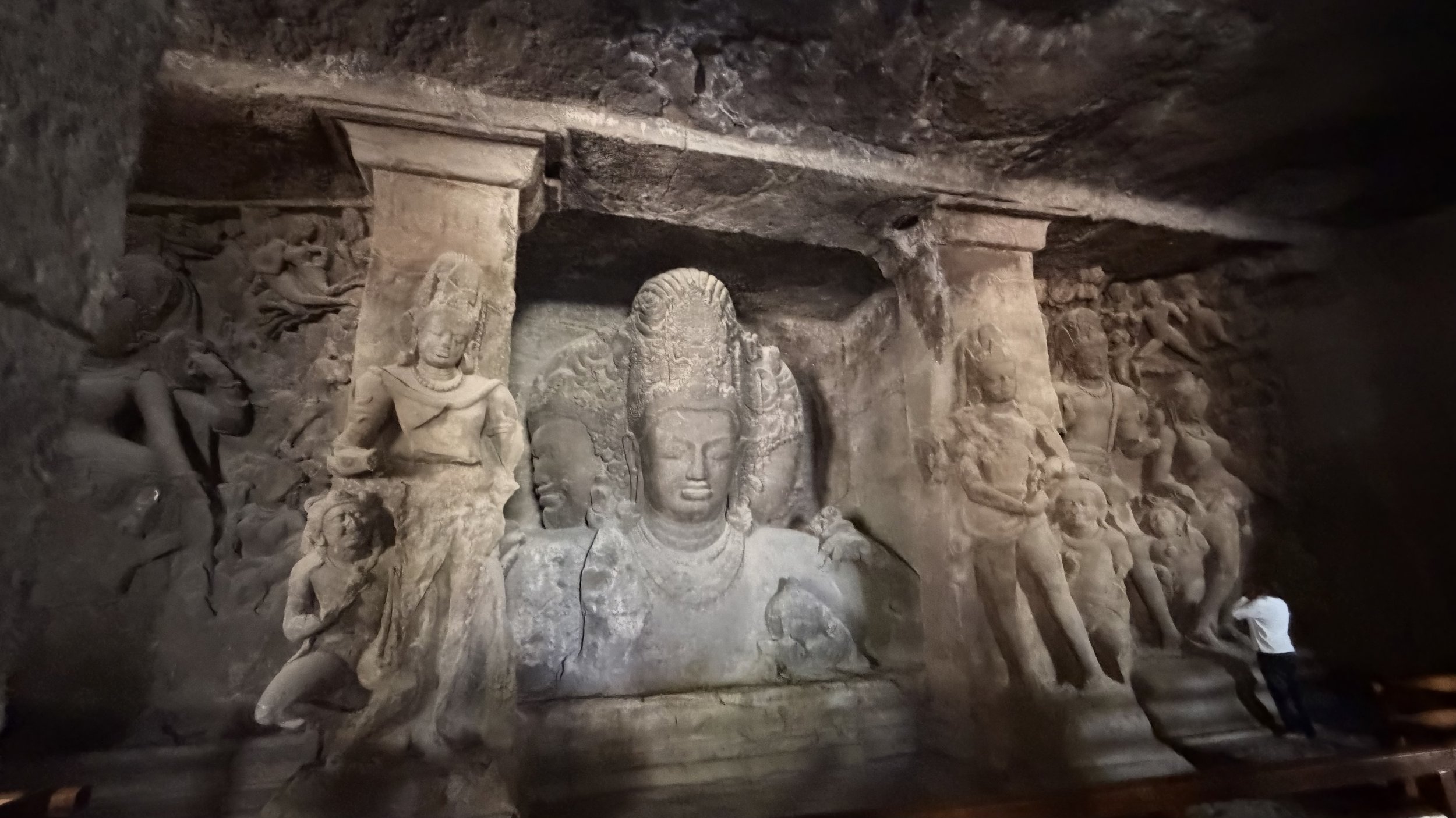 Around the walls are enormous sculpted panels depicting different aspects of Shiva, each carved directly from the living rock. The scale is astonishing. Figures several metres high emerge from the stone with flowing hair, elaborate headdresses and powerful physical presence. Some of the sculptures remain remarkably detailed, while others show the scars of time and damage, with broken arms or weathered faces where centuries have taken their toll.