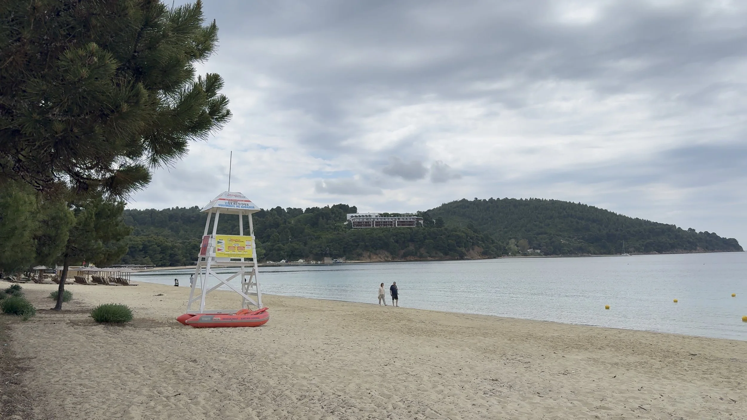When we arrived, Koukounaries was almost empty. The wide sweep of sand lay pale and undisturbed beneath a heavy sky, the sea calm and muted, its usual sparkle softened by cloud. Pine trees edged the beach, their scent faint but unmistakable, carried on the still air.